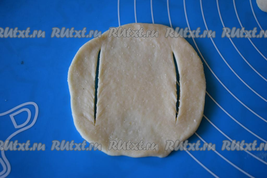 Далее каждый шарик раскатываем в лепёшку и делаем 2 надреза с боков, как на фото.