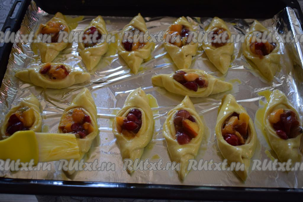 Выкладываем подготовленные пирожки с абрикосами и вишней на противень, застеленный фольгой (или пергаментом). Пирожки при помощи кулинарной кисти смазываем яйцом, взбитым вилкой с молоком.