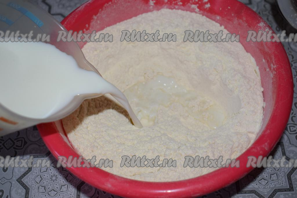 Добавляем к мучной смеси тёплое молоко (температура молока не должна превышать 40 градусов).