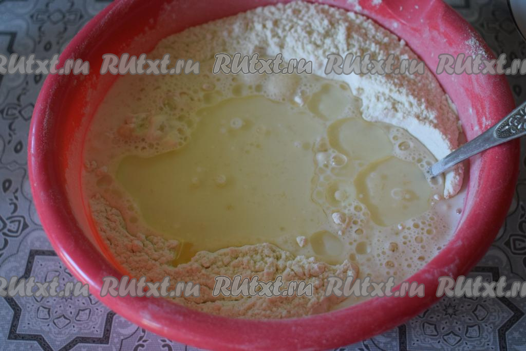 Вливаем растительное масло и начинаем замешивать дрожжевое тесто для пирожков вначале ложкой, а затем продолжаем замешивать руками. Тесто легко собирается в шар и быстро замешивается. Вымешиваем тесто до гладкости (примерно, 6-7 минут).