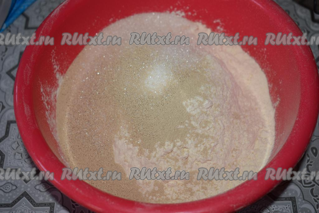 Вначале замесим тесто для пирожков, для этого в глубокую миску всыпаем муку, сахар, дрожжи и ванилин, аккуратно перемешиваем до однородности при помощи ложки.