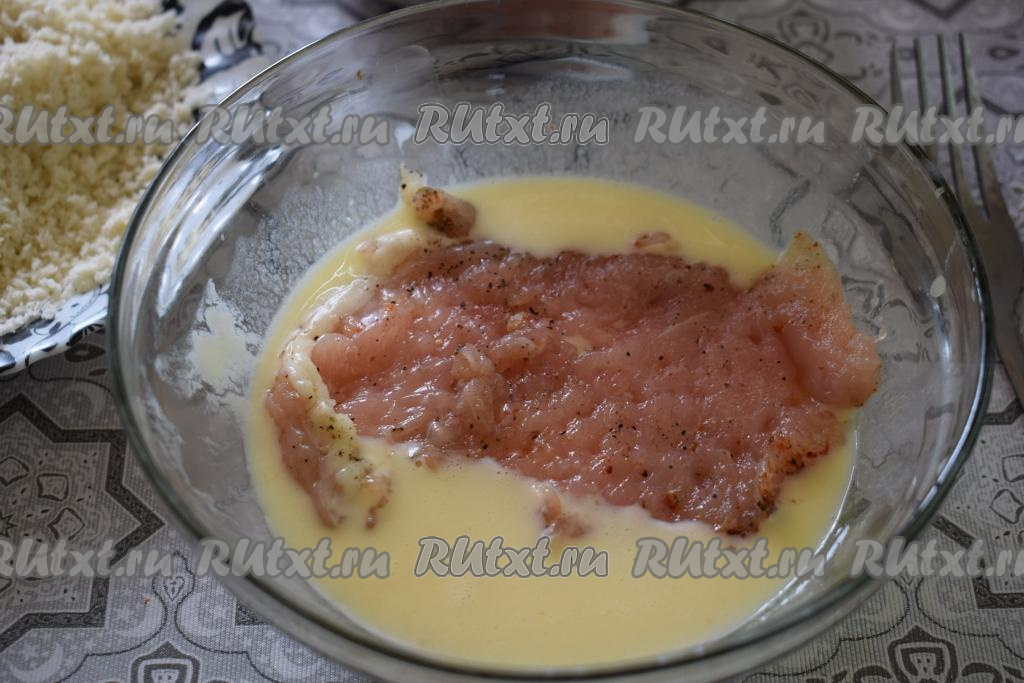 Берём отбивную из куриного филе и окунаем её в кляр так, чтобы мясо было покрыто кляром со всех сторон.