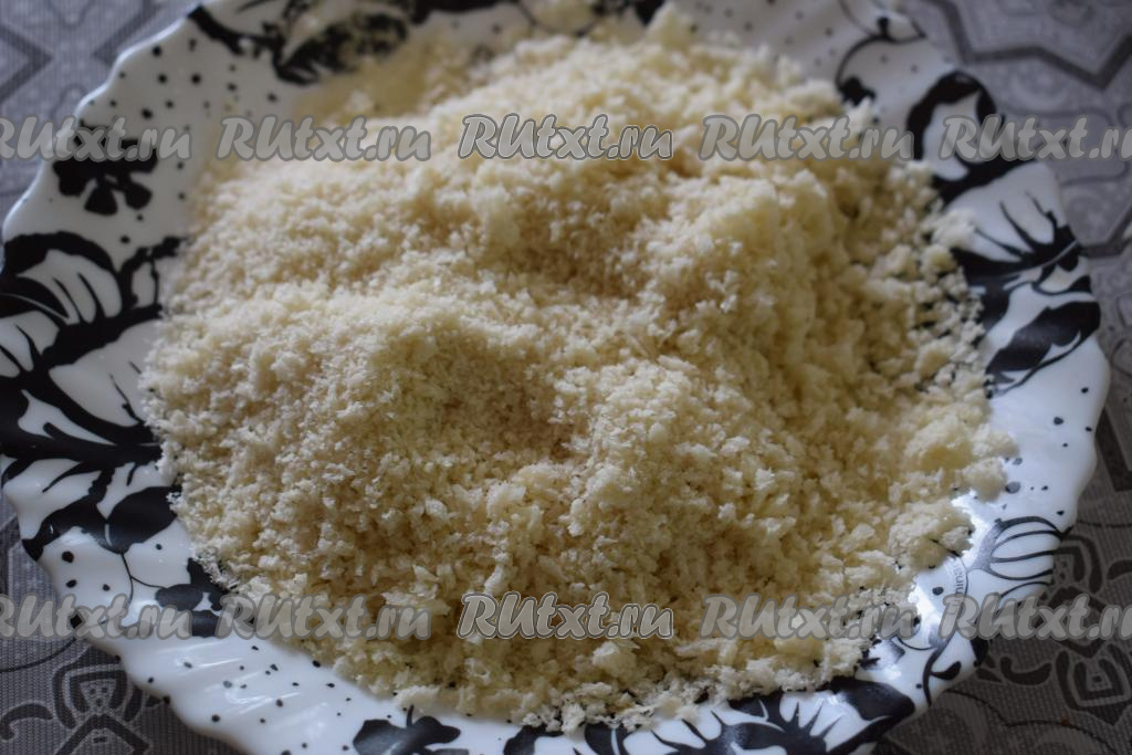 В плоскую тарелку высыпаем панировочные сухари (у меня были белые сухари крупного помола, но в данном рецепте можно использовать любые сухари).