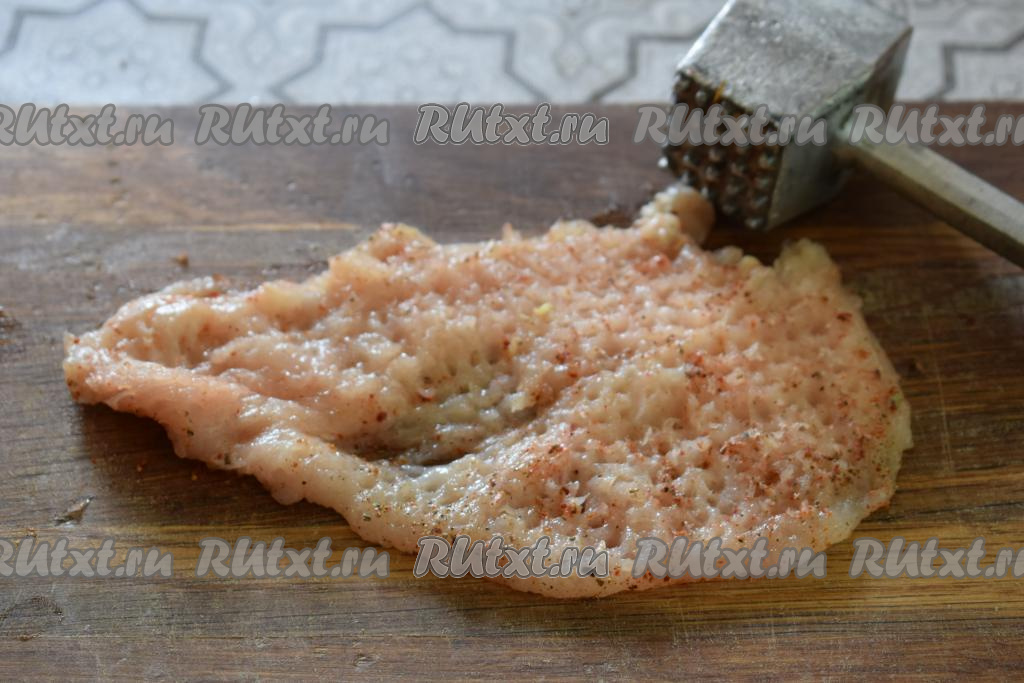 Каждую пластину отобьём молоточком для отбивных. Отбивные посыпаем солью, специями, перцем и оставляем их минут на 15-20, чтобы они просолились.