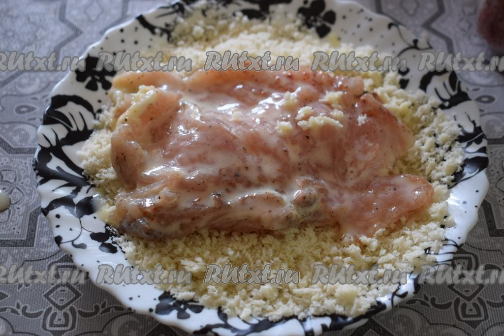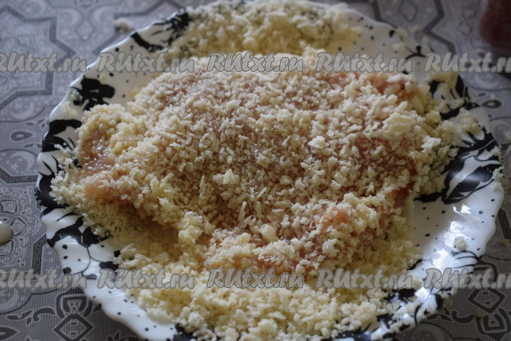 Затем обваливаем куриное филе в сухарях с двух сторон, плотно вдавливая отбивную в сухари. Таким образом подготавливаем все шницели.