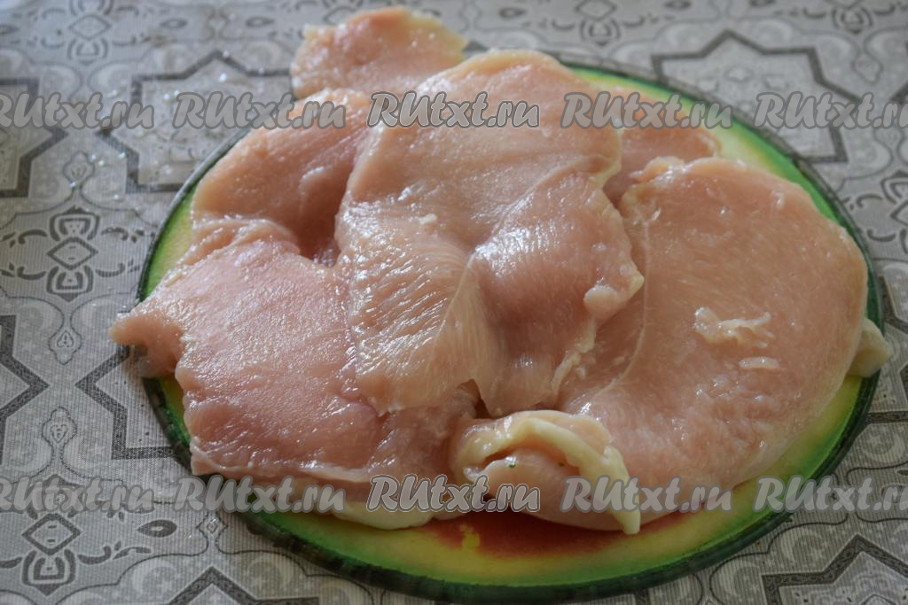Куриное филе промоем под холодной водой и удалим влагу бумажными полотенцами. Нарежем филе на тонкие пластины.