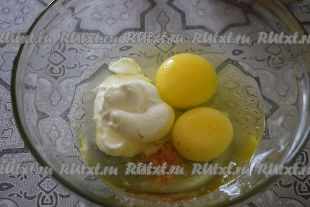 Перемешаем яйца со сметаной и солью до однородности, наш кляр готов.