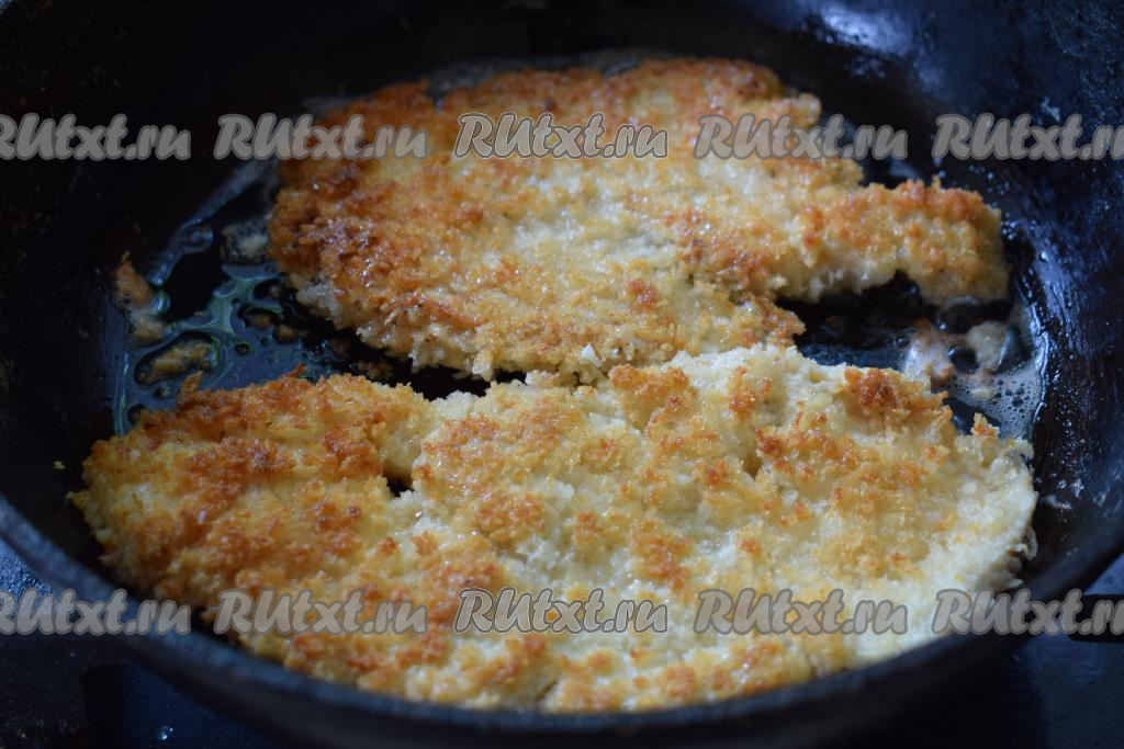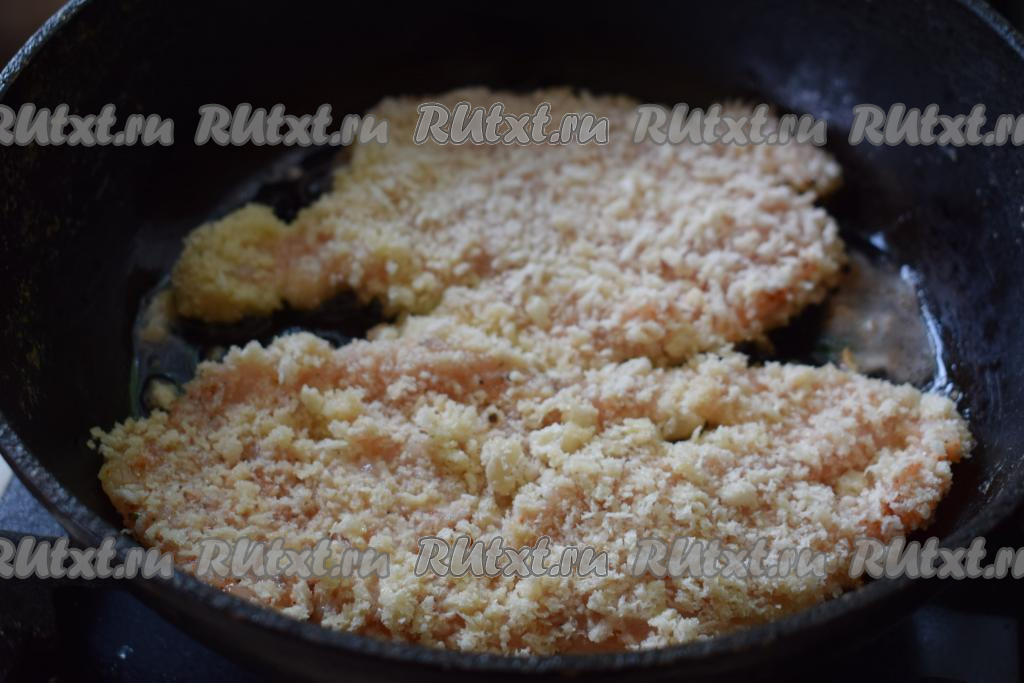 Затем переворачиваем и обжариваем ещё 8-9 минут с другой стороны, при необходимости, можно ещё раз перевернуть шницель со стороны на сторону, добиваясь румяной, золотистой корочки.