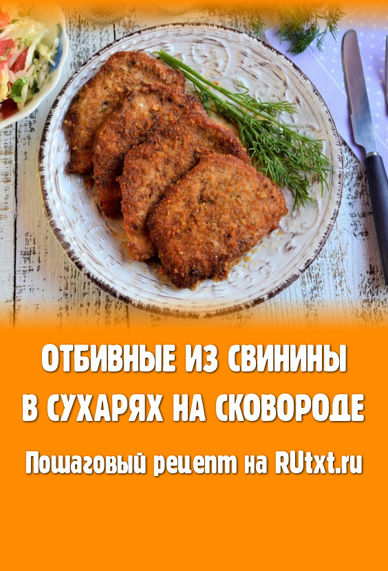 Отбивные из свинины, приготовленные в сухарях на сковороде, - простое и быстрое мясное блюдо, которое можно предложить к обеду или ужину с любым гарниром. Я обычно подаю отбивные с лёгким овощным салатиком, кто любит посытнее - можно в качестве гарнира использовать картофельное пюре, макароны, овощное рагу и т.д. Обязательно приготовьте эти очень вкусные, сочные внутри и хрустящие снаружи отбивные!