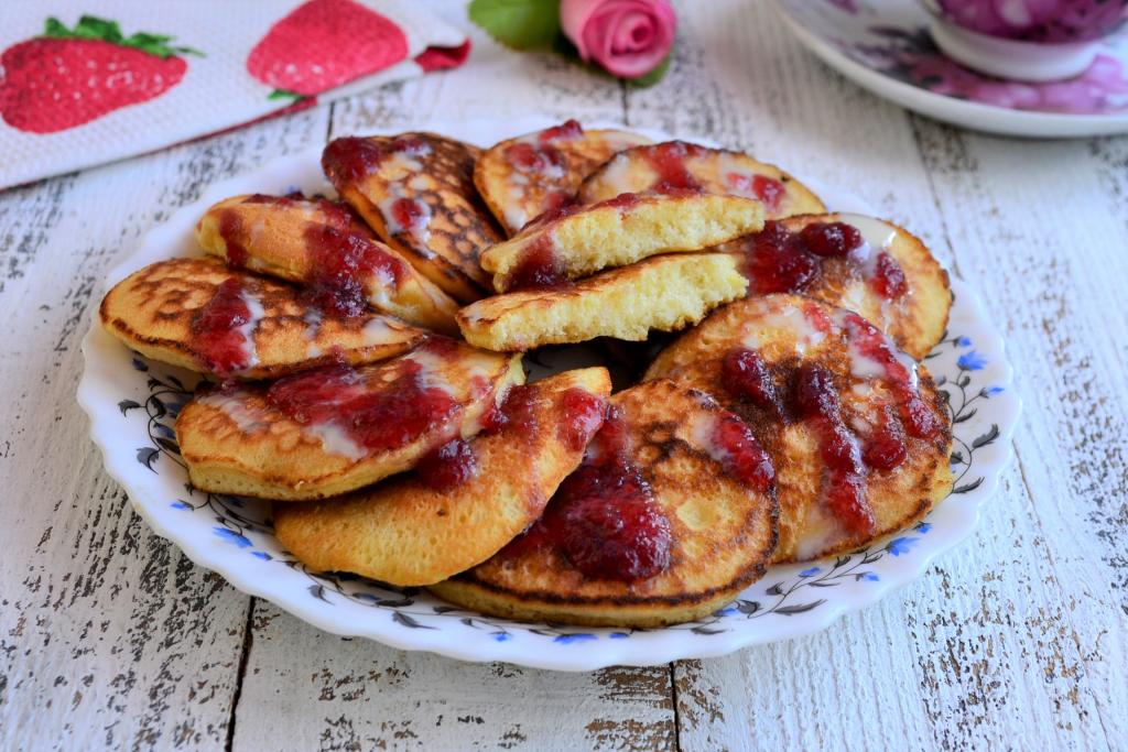 Очень нежные и вкусные бисквитные оладьи, приготовленные на сковороде, остудить и подать к столу с вареньем, сгущёнкой, дополнив чашечкой чая или стаканом молока.