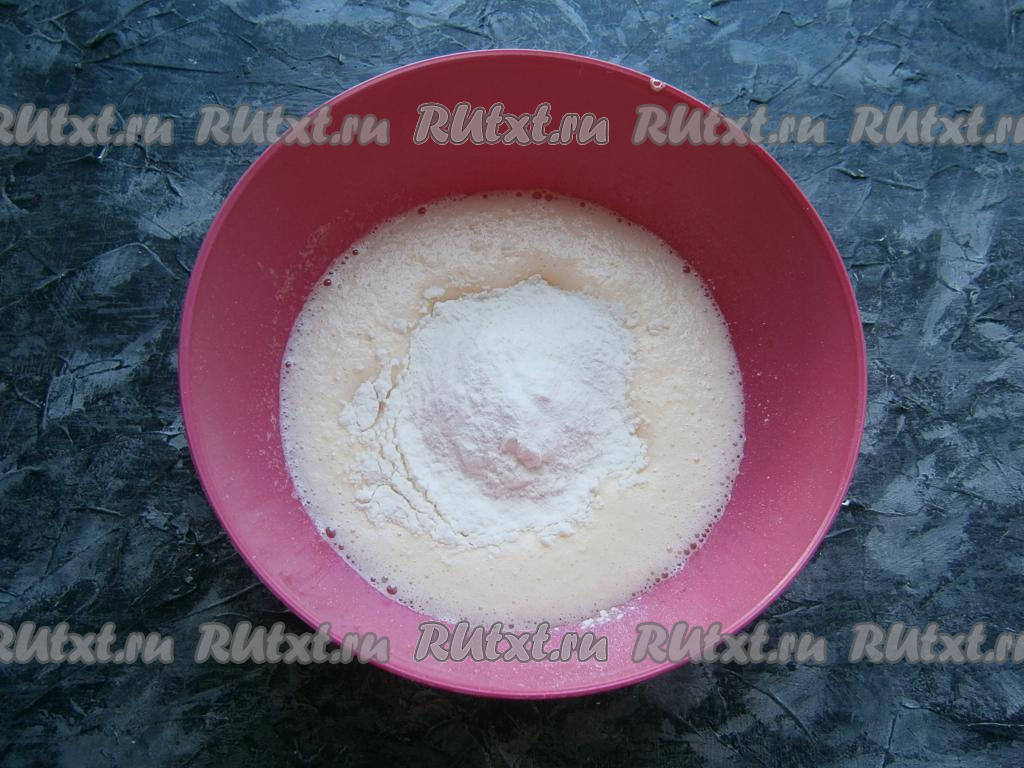Взбить яйца миксером до пышной пены, затем, постепенно всыпая сахар, взбивать далее до пышной массы (взбивать минуты 3-4). Всыпать просеянную муку с разрыхлителем и ванильным сахаром.