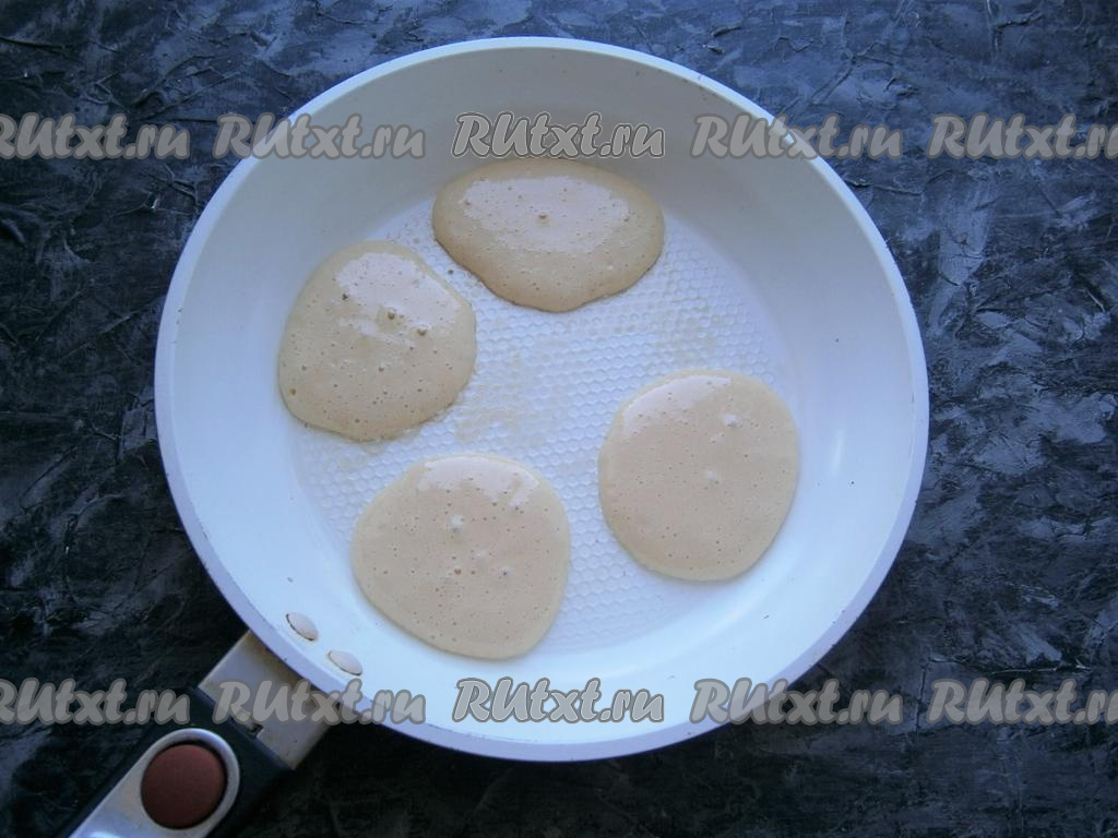 Сковороду смазать небольшим количеством сливочного масла, нагреть её. Выкладывать тесто на горячую сковороду столовой ложкой в виде небольших оладушек.