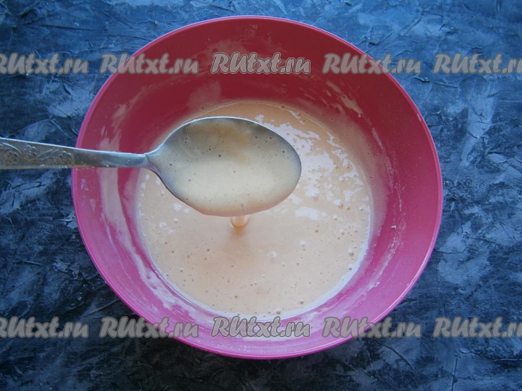 Ложкой замесить тесто, которое по консистенции будет жидковато, оно легко стекает с ложки.