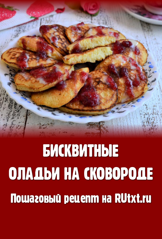 Жарить бисквитные оладьи нужно на небольшом огне до румяности (жарятся достаточно быстро - 1-2 минуты), после чего, с помощью лопатки оладьи перевернуть и жарить ещё 1 минуту. Сковорода должна быть с антипригарным дном.