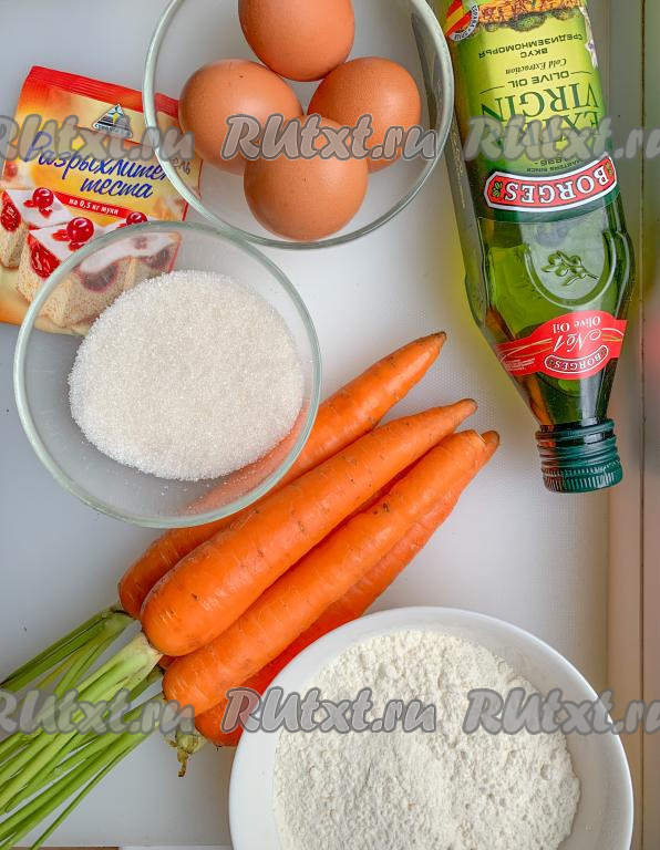 Подготовим все ингредиенты для выпечки морковного пирога. Чем слаще и сочнее морковь, тем вкуснее и нежнее будет пирог. Но если морковь очень сочная, понадобится чуть больше муки.