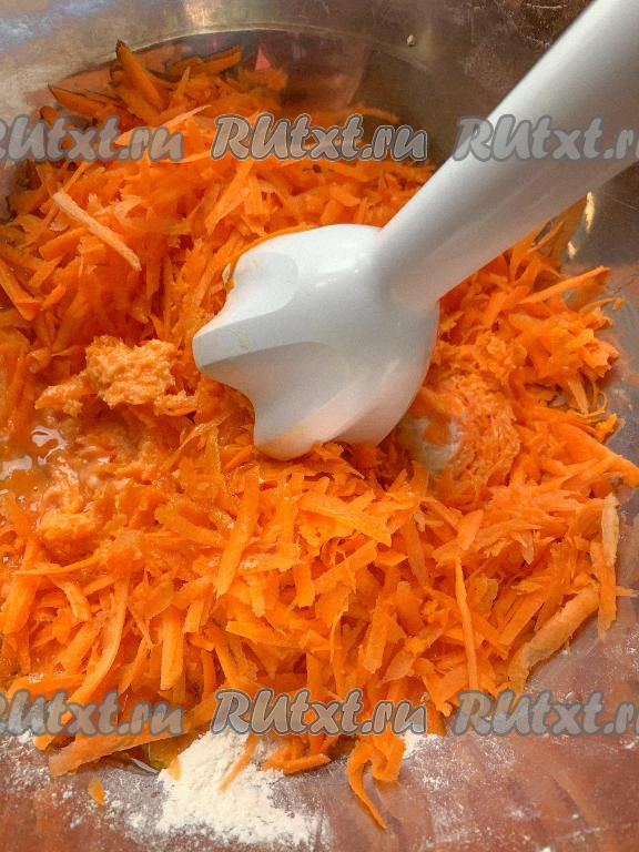 К яйцам и муке добавляем морковь и пробиваем получившуюся массу погружным блендером. Взбивать сильно не надо, только до состояния однородного теста. По консистенции тесто должно быть не жидким, но и не густым, оно должно легко переливаться в форму.