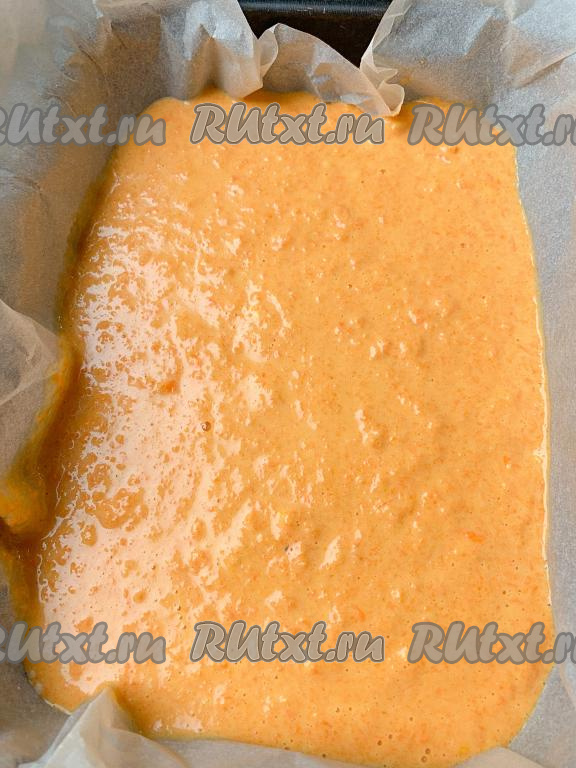 Смазываем форму для выпечки маслом (или выстилаем пекарской бумагой) и выливаем тесто в форму. Размер моей формы 20 см на 30 см. Ставим форму в горячую духовку и выпекаем морковный пирог при температуре 180 градусов. Время выпечки зависит от вашей духовки. В среднем, 45-50 минут, но надо регулярно проверять готовность выпечки, все духовки очень разные.