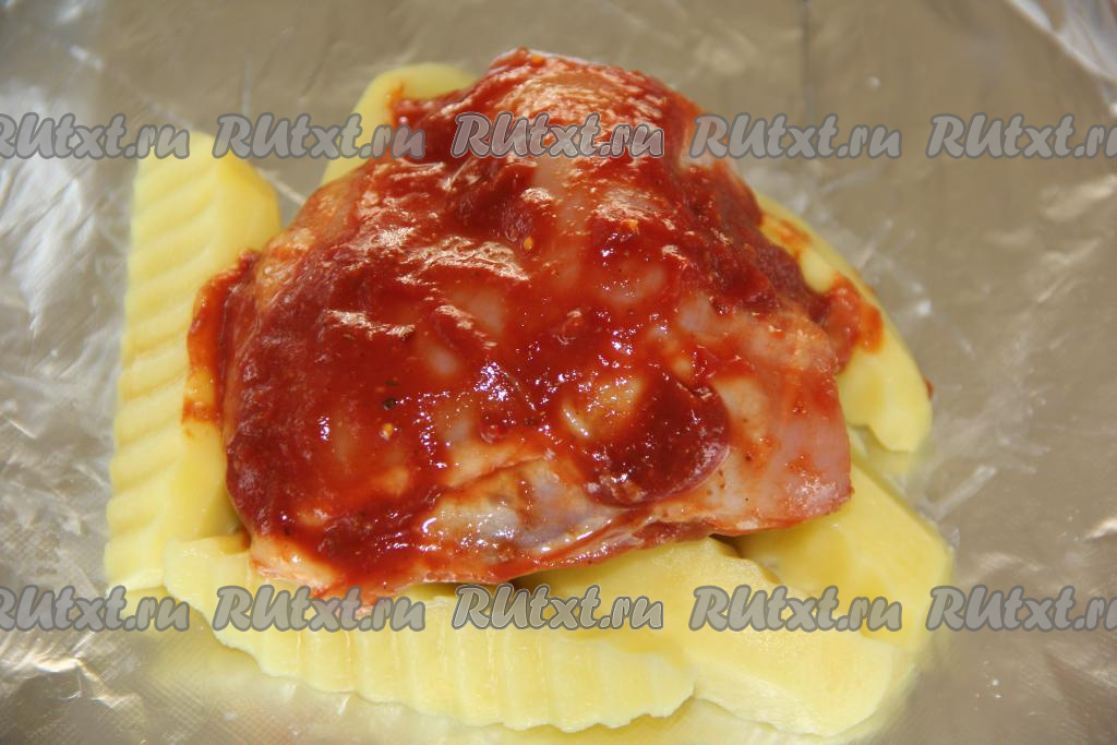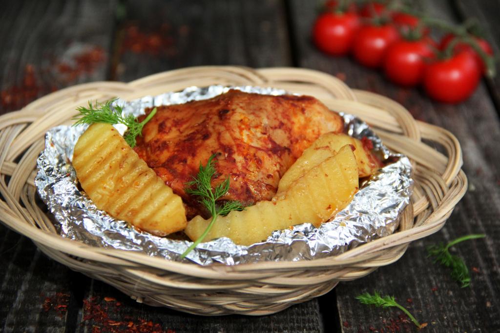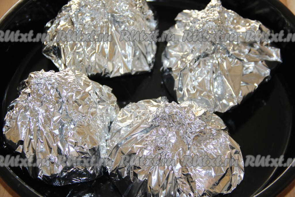 Завернуть фольгу в виде "бомбочки", закрепив края сверху. Аналогично завернуть в фольгу оставшиеся куриные бёдра и картошку. Выложить мясо с картофелем, завёрнутые в фольгу, на противень и поставить в разогретую духовку. Готовить блюдо в течение 50 минут при температуре 220 градусов.