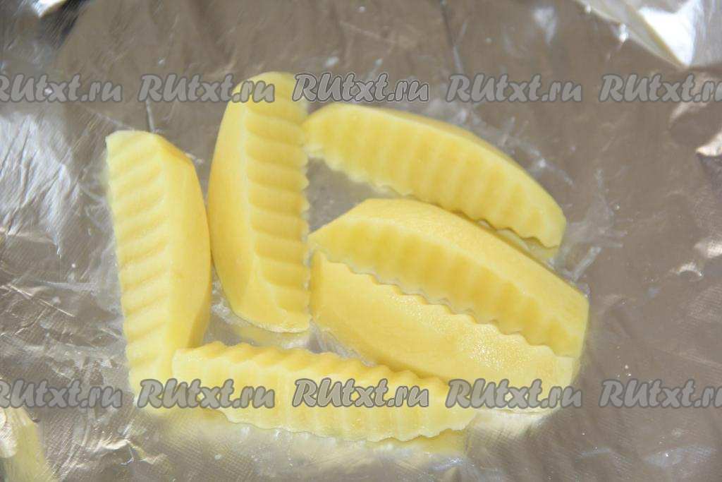Картофель почистить и нарезать крупными дольками. На кусок фольги выложить несколько долек картофеля. Я картофель не солила, во время приготовления он пропитался маринадом от курицы.