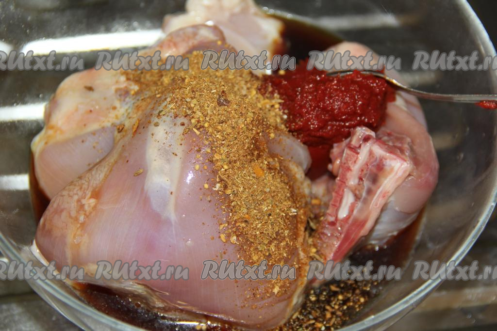 К куриным бёдрам добавить соль, томатную пасту и специи (можно взять любые специи).