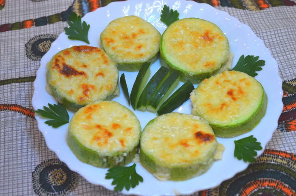 По прошествии времени сырно-сметанная заправка немного растечётся по противню, а кабачки будут уже достаточно мягкими, но будут держать форму.