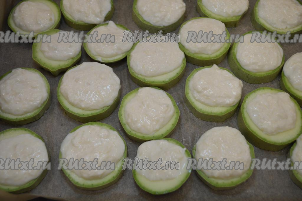 На каждый кружочек кабачка выложить по чайной ложке сырно-сметанной массы. Запекать кабачки в разогретой до 180 градусов духовке около 20-25 минут (до приятного золотистого цвета).