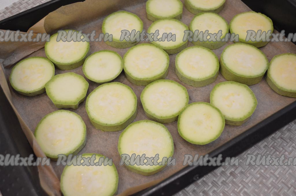 Для этого блюда идеально подойдёт молодой кабачок среднего размера с мелкими семечками и тонкой кожурой, которую можно не срезать. Хорошо вымыть, а затем обсушить кабачок, срезать кончики с двух сторон. Нарезать кабачок на кружочки толщиной около 1 см. Подходящий по размеру противень застелить пекарской бумагой и выложить на бумагу кружочки кабачков, посолить их.