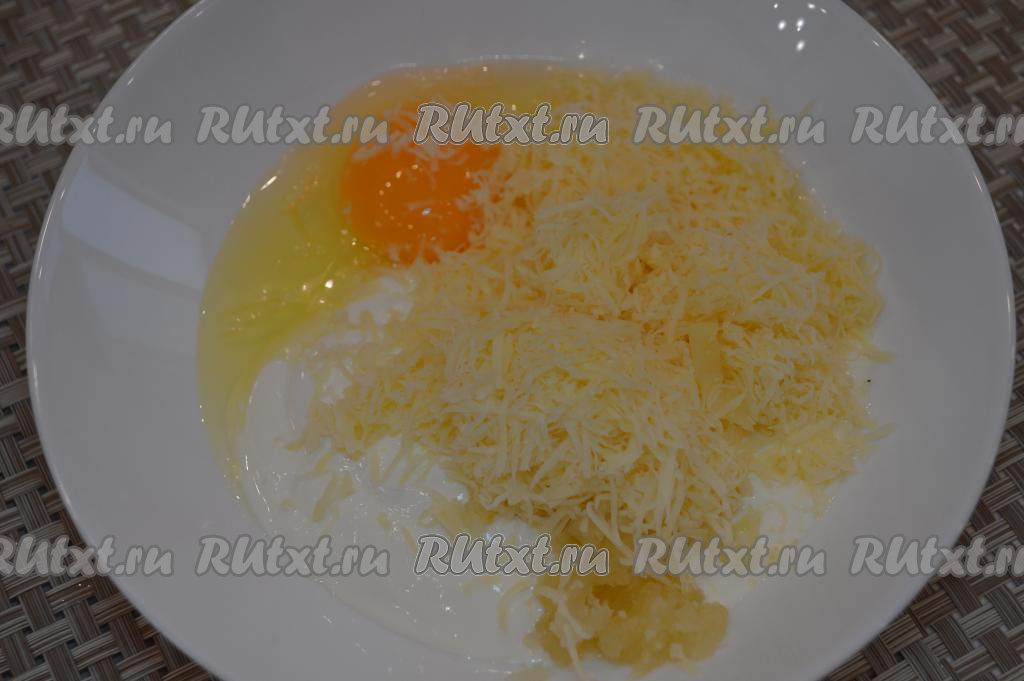 Отдельно натереть твёрдый сыр и добавить его к сметане, чесноку и яйцу. Перемешать сырно-сметанную массу, она должна получиться достаточно густой.