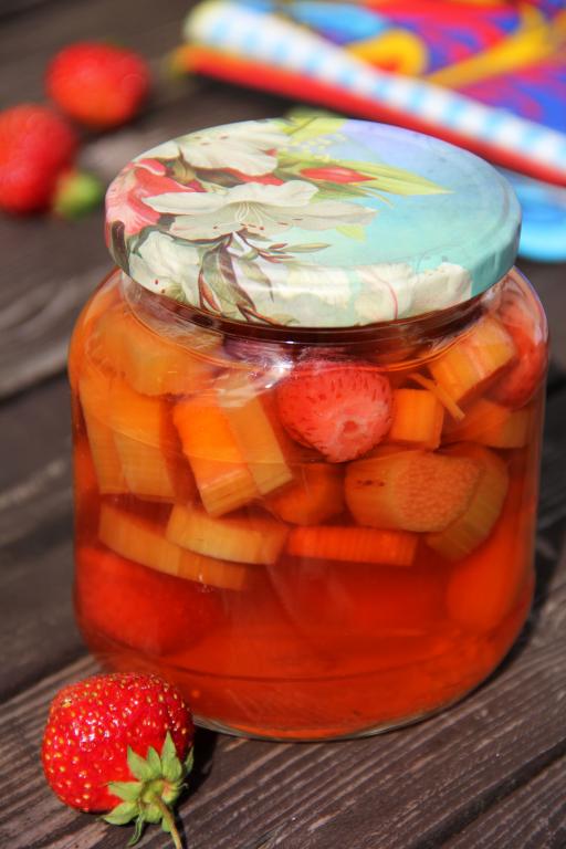 Сразу закрутить банки с клубнично-ревеневым компотом крышками и перевернуть кверху дном. Укутать баночки в одеяло, оставить до полного остывания. Остывшие банки убрать на хранение в тёмное и прохладное место. Приготовьте компот из ревеня с клубникой по этому рецепту, а зимой насладитесь его насыщенным вкусом и ароматом.