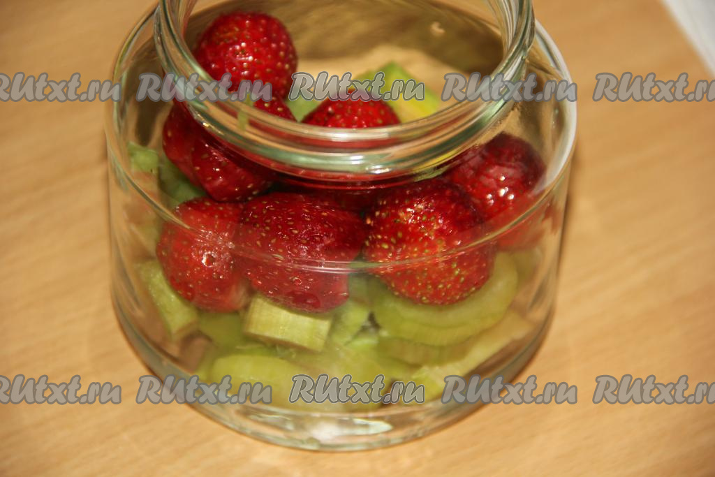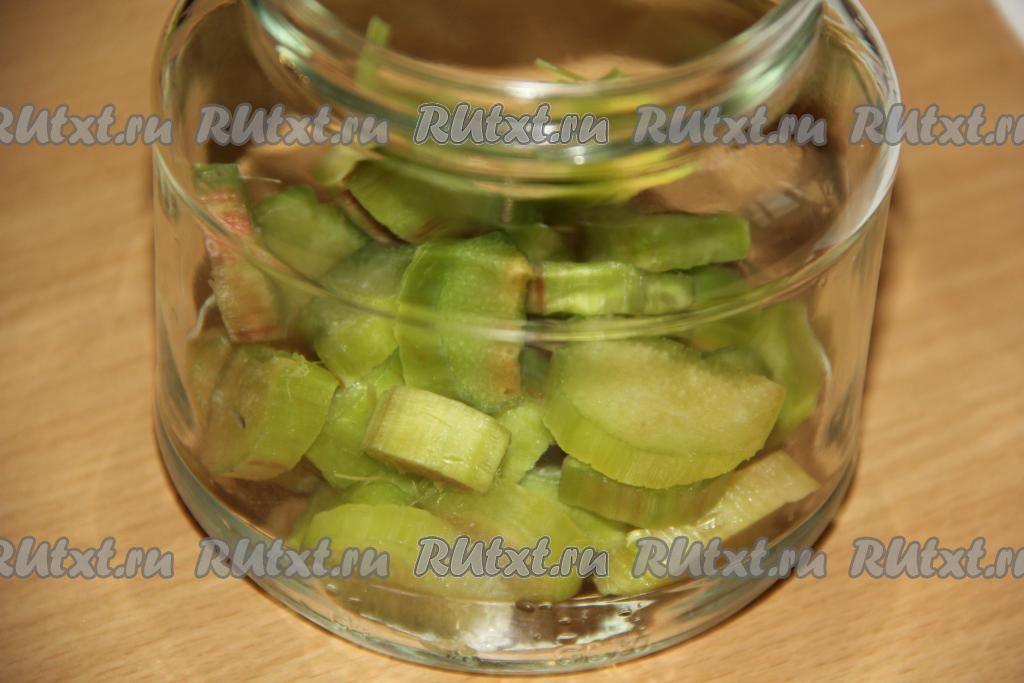 В простерилизованные банки разложить кусочки ревеня. Я просто поровну разделила на все баночки.