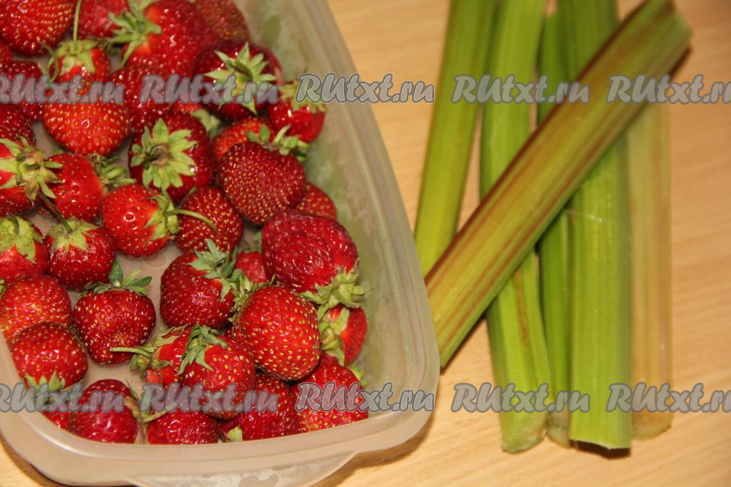 Стебли ревеня вымыть и снять тонкую плёнку по всей длине каждого стебля. Клубнику очистить от чашелистиков и вымыть.