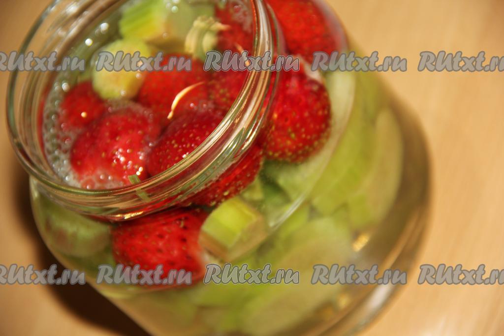 Банки с ревенем и клубникой до самого горлышка залить горячим сиропом.