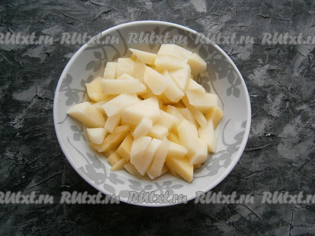 Нарезать на небольшие кусочки картошку.