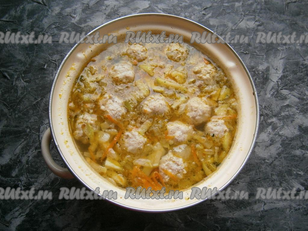 Выложить в кастрюлю с картошкой, луком, кабачками и морковкой подготовленные фрикадельки, лавровый лист и измельчённый чеснок, довести суп до кипения, а затем варить минут 10 на медленном огне и снять с огня.