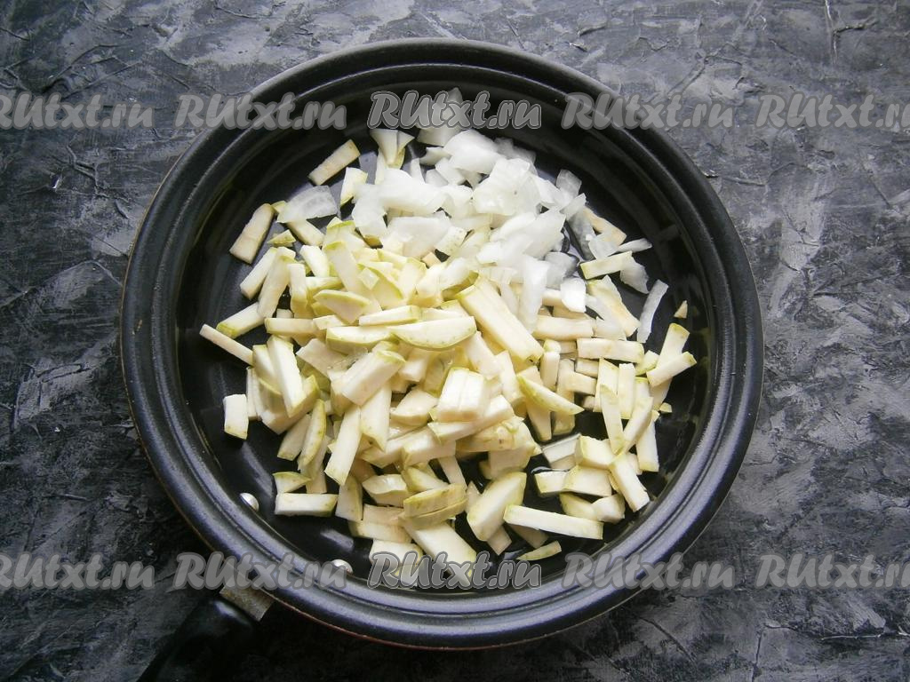 Если у кабачков тоненькая шкурка, её можно не срезать. Нарезать кабачки на небольшие брусочки и вместе с одной мелко нарезанной луковицей выложить в сковороду, влить растительное масло.
