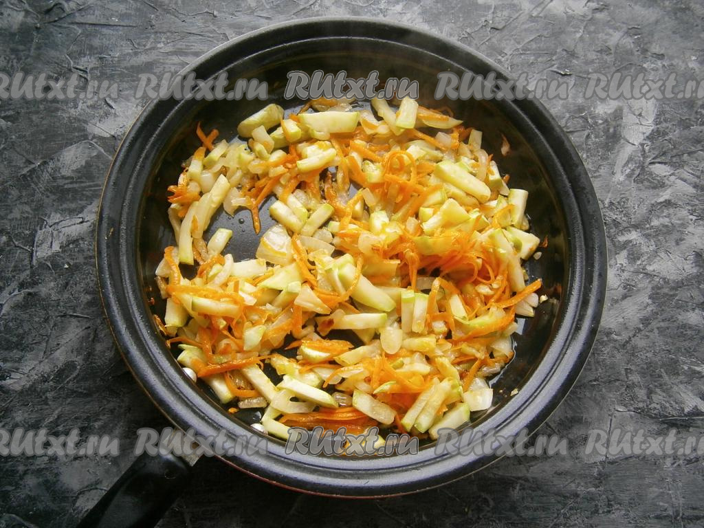 Кабачки с луком обжарить, помешивая, до лёгкой румяности (3-4 минуты) на среднем огне, затем добавить морковку, натёртую на крупной тёрке, и перемешать.