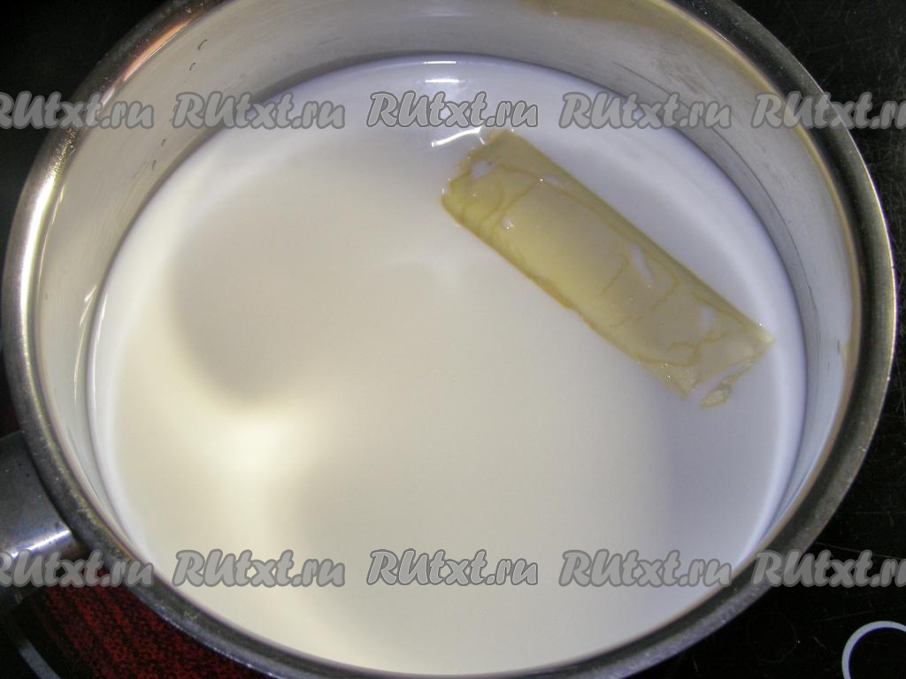 Молоко перемешиваем со сливками, добавляем сливочное масло и нагреваем в сотейнике на среднем огне, помешивая, пока масло не растает (на этом этапе доводить молочную смесь до кипения не нужно).