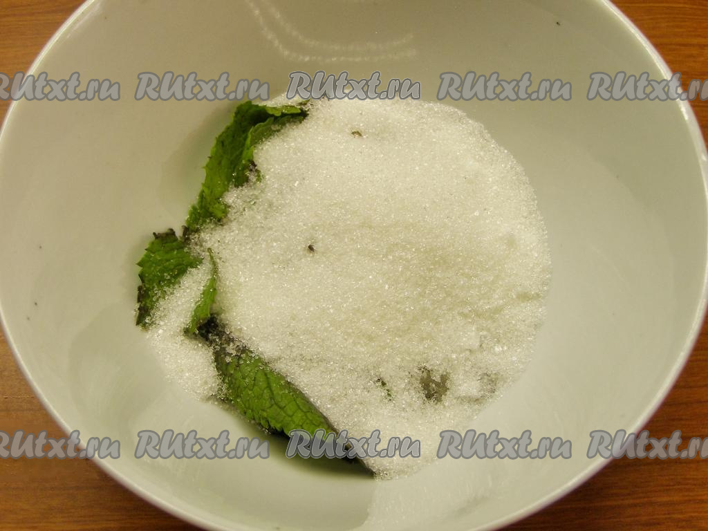 Мяту хорошо моем в проточной воде, слегка просушиваем полотенцем и отрываем листочки от веточек. Перекладываем листочки в ёмкость, добавляем 50 грамм сахара и измельчаем блендером, пока не получится кашица. Отставляем сахарно-мятную смесь в сторону, она нам понадобится в конце.