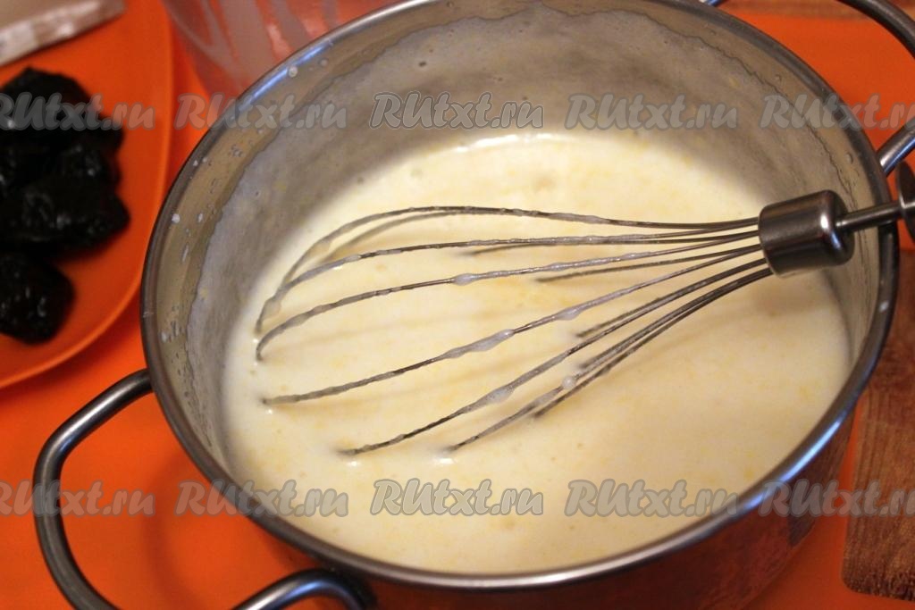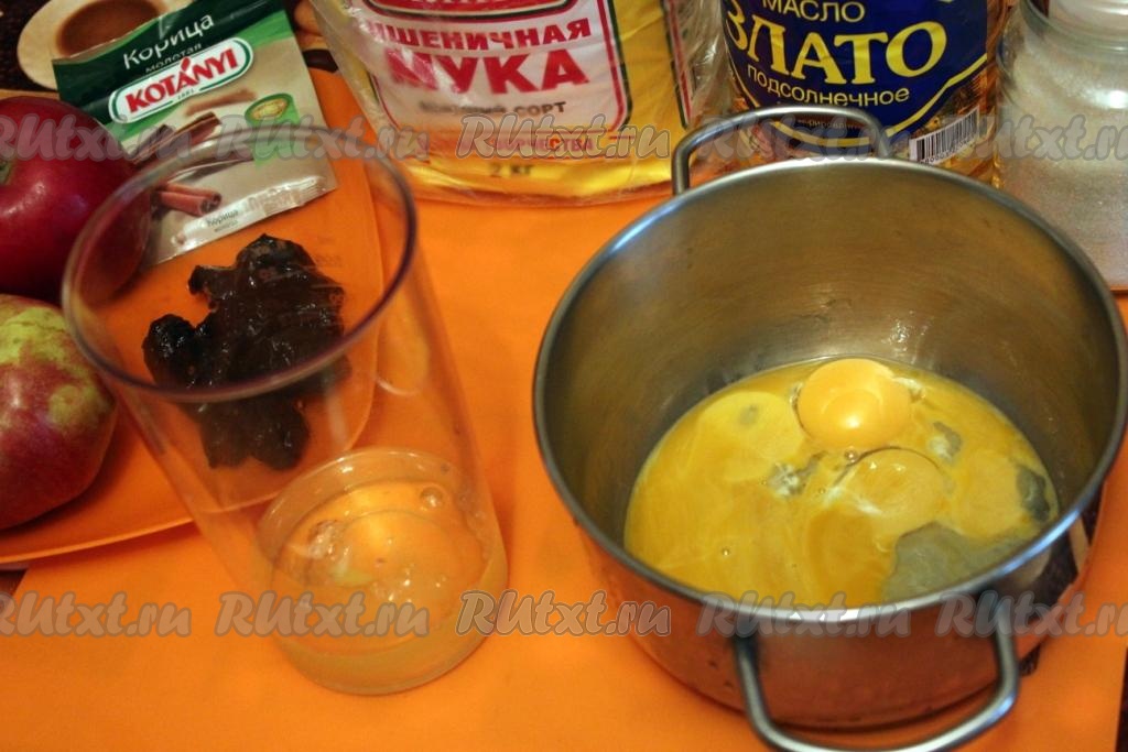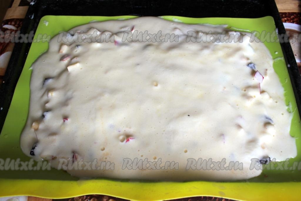 Залейте яблоки и чернослив тестом и поставьте противень в разогретую духовку на 15 минут.