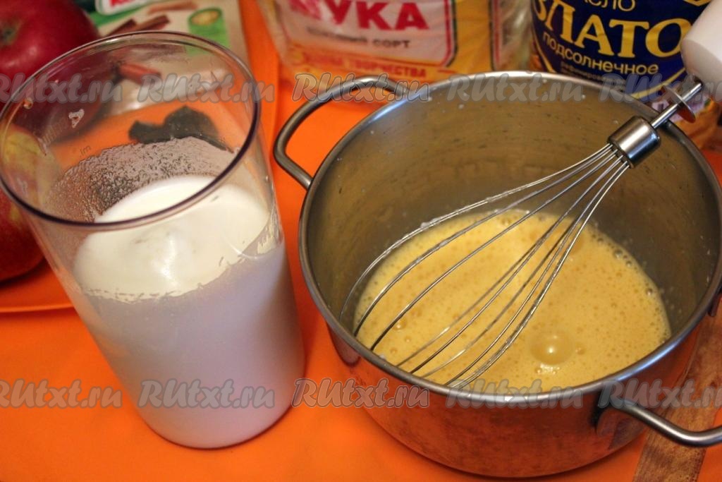 Добавьте к взбитым желткам муку с разрыхлителем, растительное масло и тщательно перемешайте венчиком (или миксером).