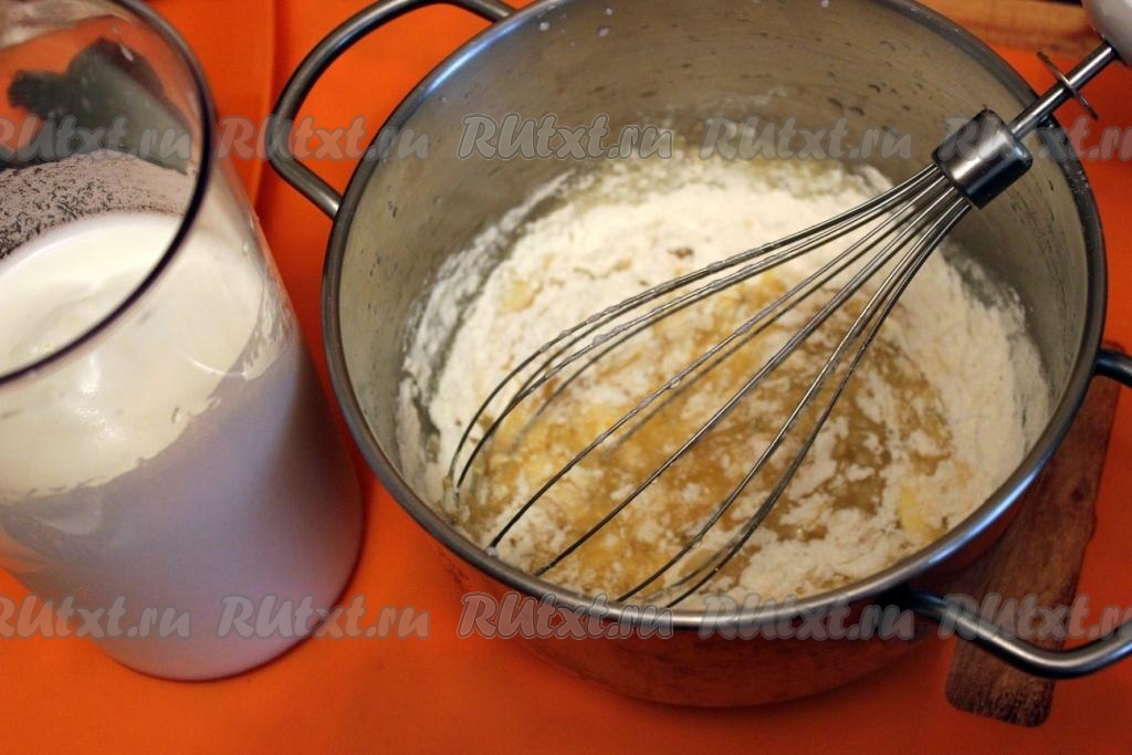 Затем, аккуратно перемешивая венчиком (или лопаткой), введите в получившуюся массу взбитые с сахаром белки. Тесто получится достаточно жидким, но пышным. Включите духовку на 180 градусов.