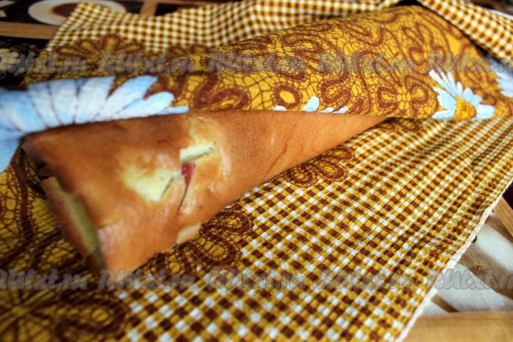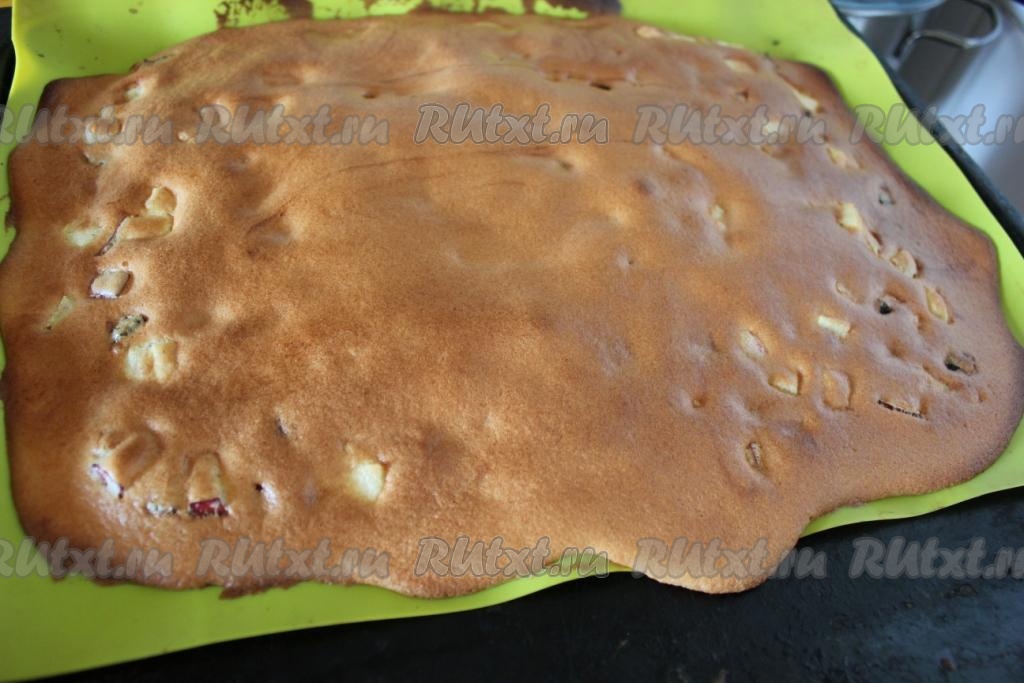 Испечённый бисквит с яблоками переверните на полотенце из ткани, уберите коврик (или бумагу для выпечки). Прямо в тёплом виде аккуратно сверните бисквит в рулет.