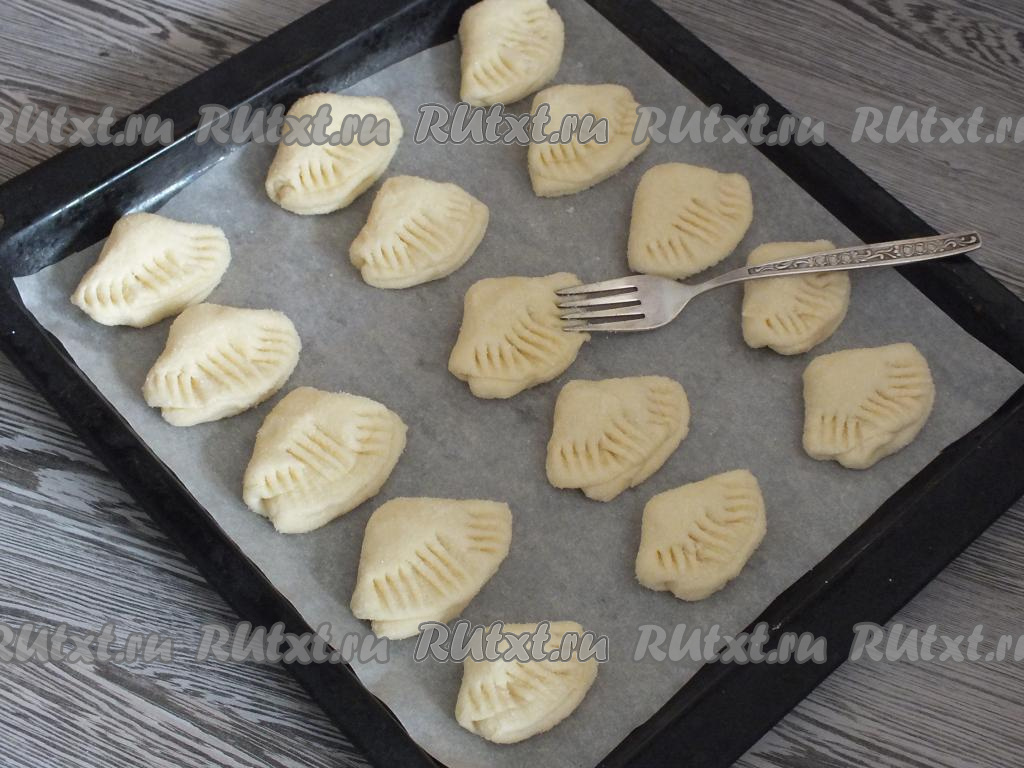 Выложите будущее творожное печенье на противень, застеленный пергаментом. Вилкой прижмите края печенья (как на фото), чтобы оно внешне напоминало "гусиные лапки". Поставьте противень в разогретую до 200 градусов духовку минут на 25. Учитывайте особенности своей духовки!