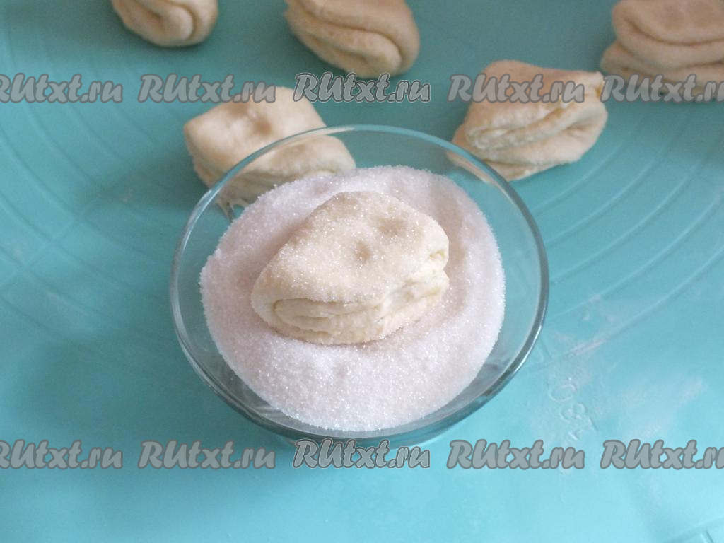 Каждую треугольную заготовку обваляйте с двух сторон в сахаре.