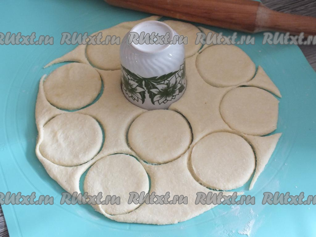 По прошествии 1,5 часов достаньте тесто из холодильника. Припылите рабочую поверхность 1 столовой ложкой без горки муки. Раскатайте тесто в пласт толщиной 0,5 см. С помощью бокала (или стакана) вырежьте кружочки. Обрезки теста соберите, рабочую поверхность можно ещё немного припылить мукой, опять раскатайте оставшееся тесто и опять вырежьте кружочки. И так до тех пор, пока не закончится тесто.