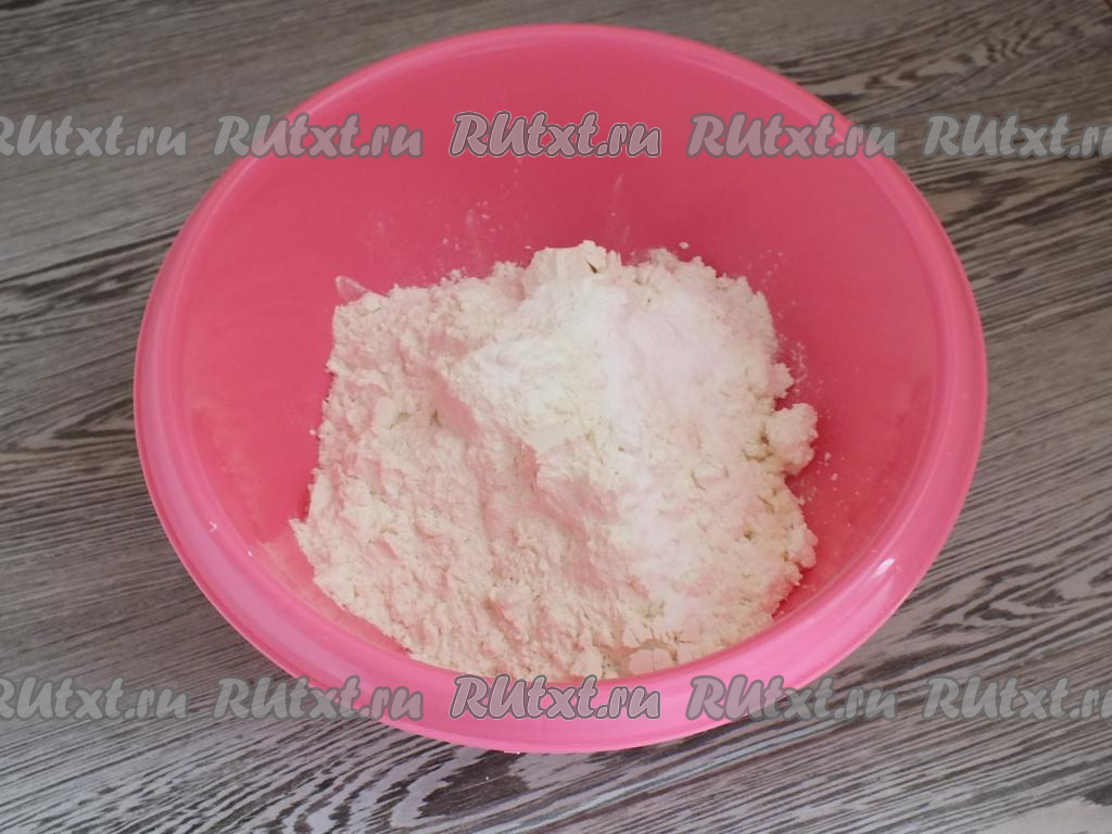 В глубокой миске смешайте творог, кусочки холодного сливочного масла (из холодильника), муку, ванилин и разрыхлитель.