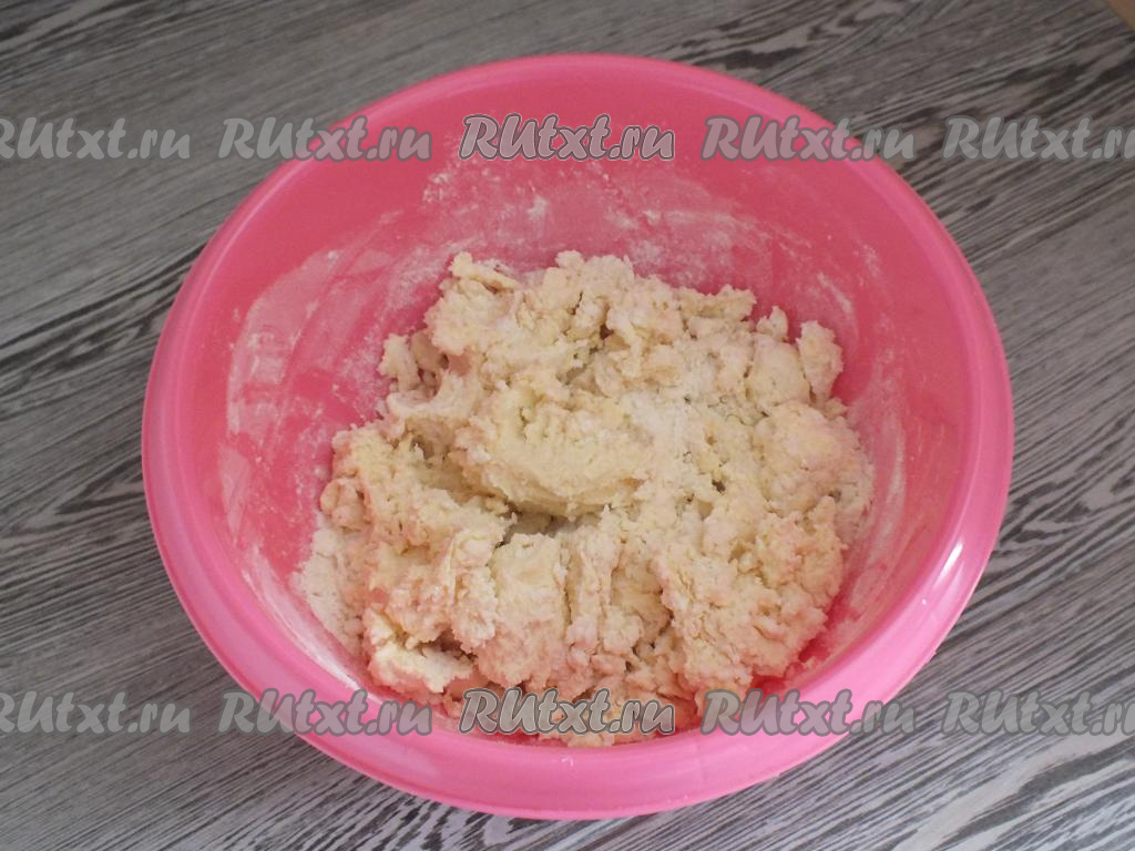 Сначала перемешивайте творожное тесто ложкой, когда станет трудно перемешивать, начните замес руками. Вначале тесто будет слегка крошиться, но в итоге соберётся в комок.