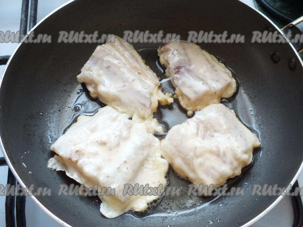 Выложите кусочки филе минтая в кляре на разогретую сковороду. Обжаривайте рыбку в течение 5 минут на огне чуть ниже среднего.