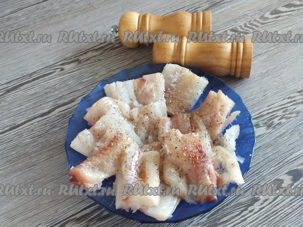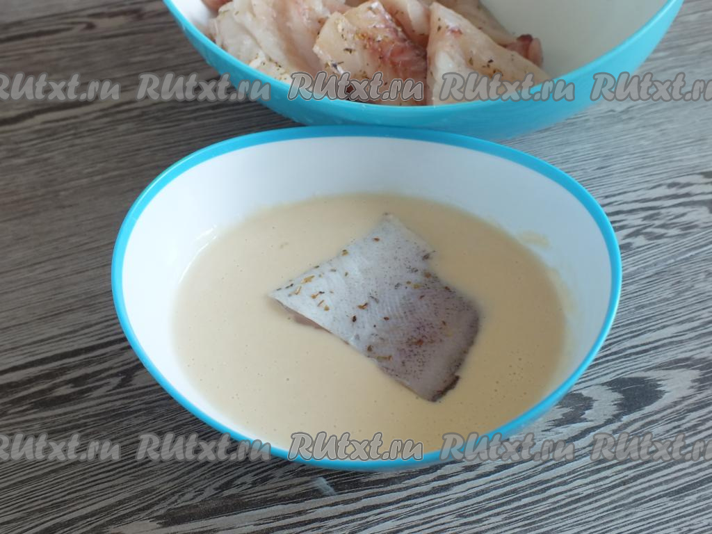 Филе минтая посолите, добавьте молотый чёрный перец по вкусу. Оставьте на время, пока будете делать кляр.
