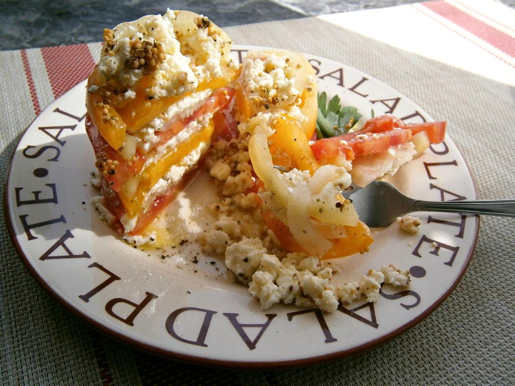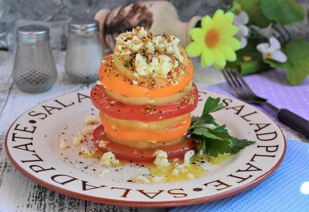 Далее выложить кружочек жёлтого помидора и повторить слои (перец, лук, соль, заправка, сулугуни, заправка), затем выложить кружочек красного помидора, снова повторить слои, выложить кружочек жёлтого помидора, повторить слои. Сверху горкой выложить раскрошенный сулугуни, щедро полить салат заправкой.